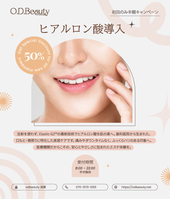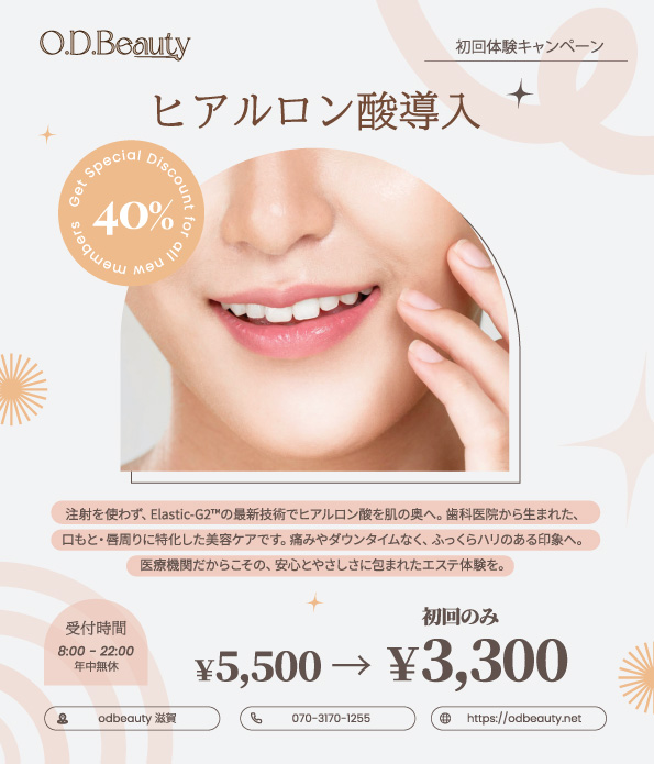 注射を使わず、Elastic-G2™の最新技術でヒアルロン酸を肌の奥へ。歯科医院から生まれた、口もと・唇周りに特化した美容ケアです。痛みやダウンタイムなく、ふっくらハリのある印象へ。医療機関だからこその、安心とやさしさに包まれたエステ体験を。